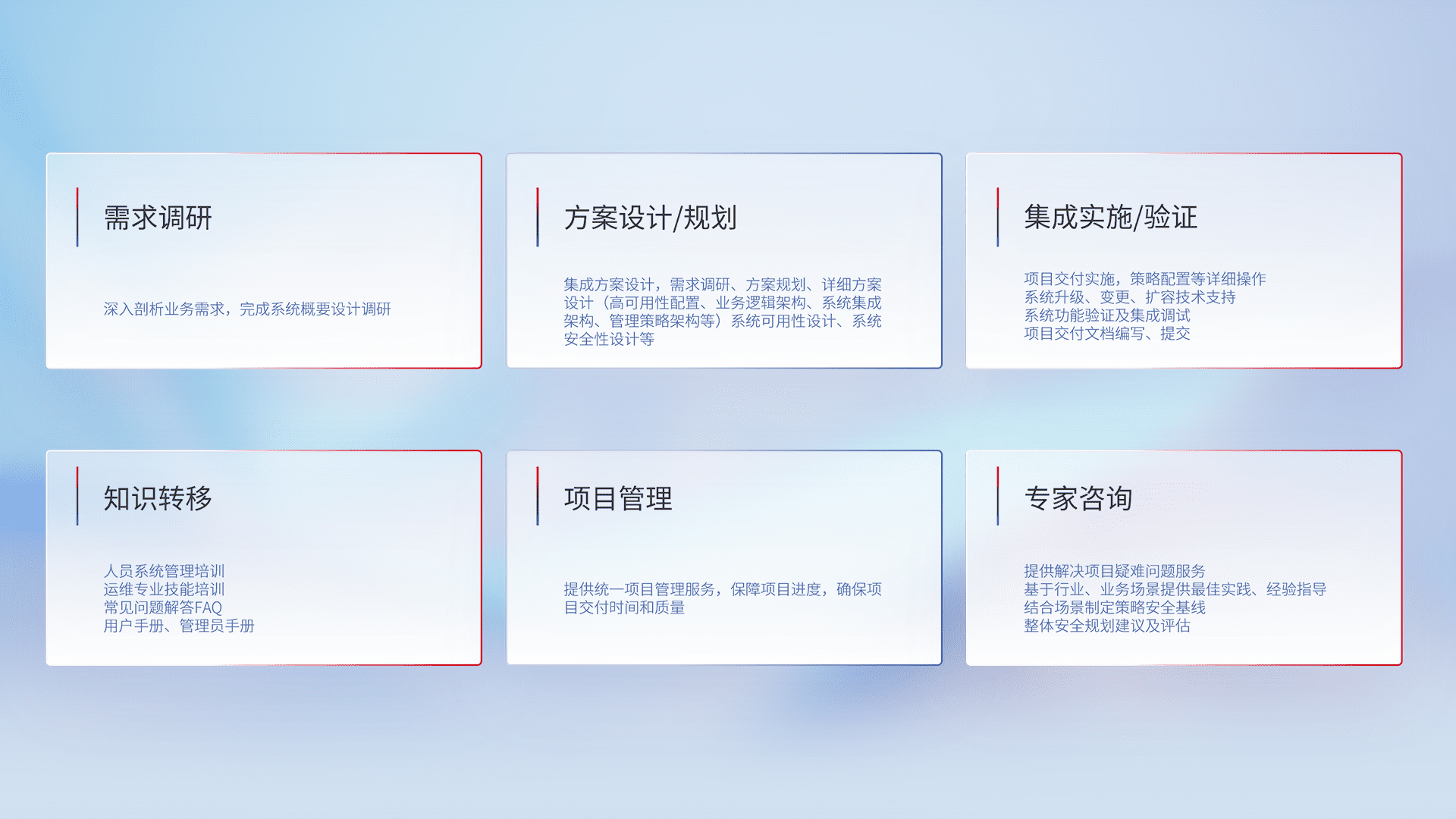 针对客户行业特性,,将宏观的安全战略和需求,,通过专业的交付服务,,,实现项目落地,,,,为客户提供标准规范的集成交付服务。。。。